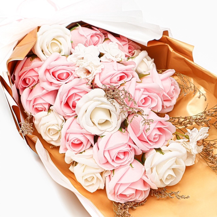Состоит из 20 роскошных цветов, выполненных из мыльного материала, который внешне не отличим от живых бутонов. Прекрасный выбор как для украшения интерьера, так и для оригинального презента, который сохранит свою красоту и символику на долгие годы.