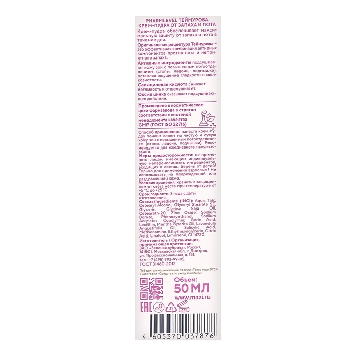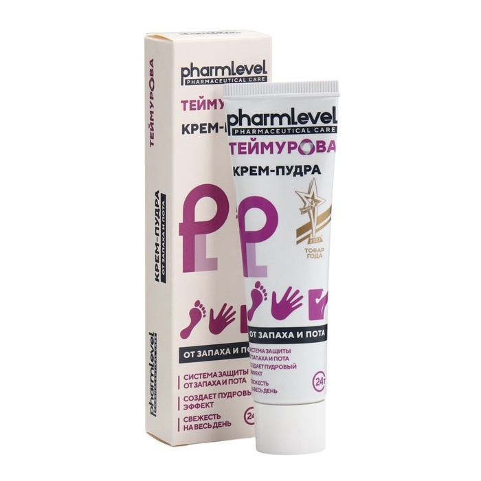 Крем-пудра от запаха и пота «Теймурова» — это инновационное средство, разработанное специально для борьбы с избыточной потливостью и неприятным запахом. Уникальная формула продукта основана на оригинальной рецептуре Теймурова, которая обеспечивает максимальную защиту от запаха и пота в течение дня.