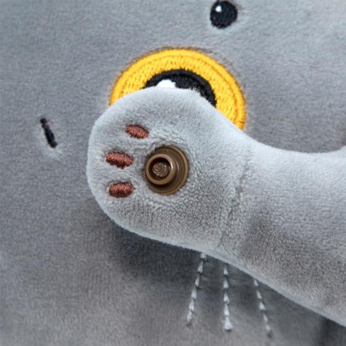 - Котёнок ловко сворачивается колечком, его лапки соединяются благодаря кнопкам-застёжкам и надёжно фиксируют положение подушки вокруг шеи.