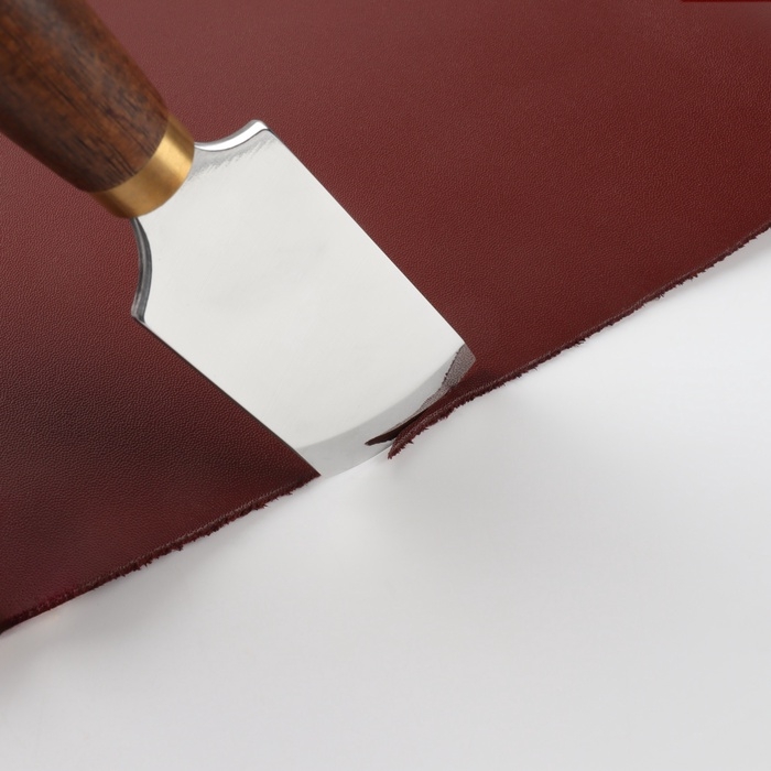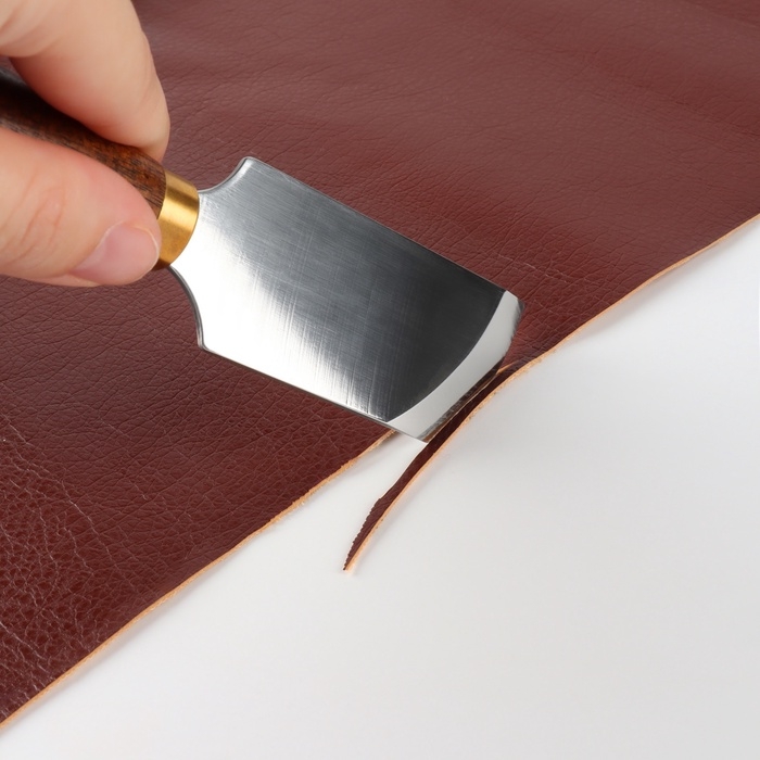 Шорный нож со скошенным лезвием — это незаменимый инструмент для мастеров, работающих с кожей. Его уникальная форма и конструкция позволяют легко и точно выполнять различные операции, такие как шерфование (уменьшение толщины, утоньшение кожи в конкретных местах), раскрой кожи и формирование краёв.