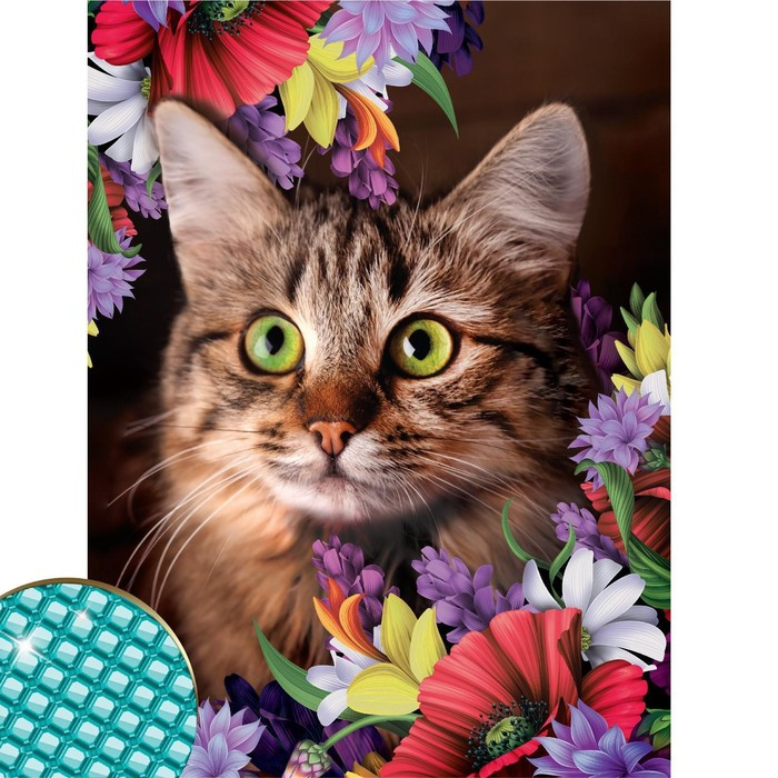 Алмазная мозаика с полным заполнением «Кот в цветах» 30х40 см, холст, ёмкость