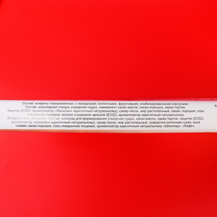 - конфеты глазированные с помадными комбинированными корпусами. Состав: сахар, патока, молоко сгущённое обезжиренное, растительные масла, в том числе соевое, какао-порошок, агент желирующий пектин фруктовый, какао тертое, соль поваренная пищевая, эмульгаторы (лецитин соевый, Е476), фермент инвертаза, антиокислитель смесь токоферолов, краситель сахарный колер, ароматизаторы. Может содержать незначительное количество глютена, молокопродуктов, орехов, арахиса, яичного белка.