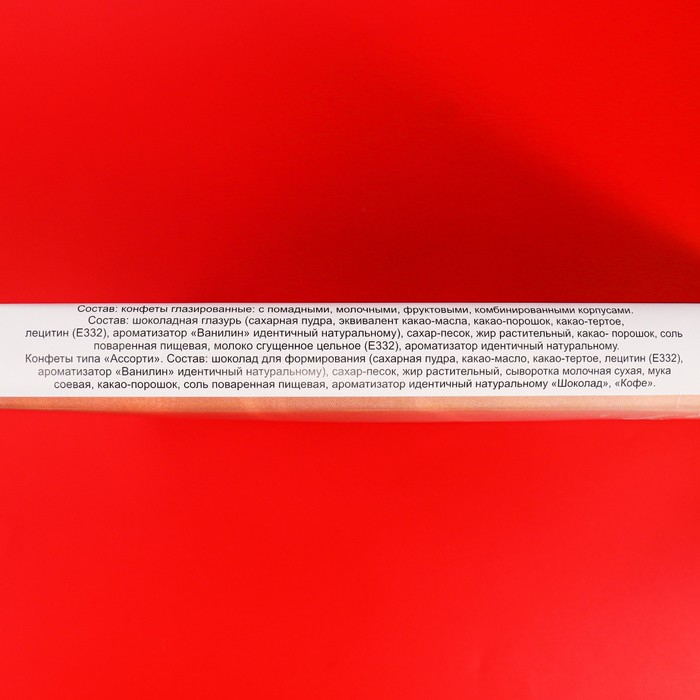 - конфеты глазированные с помадными комбинированными корпусами. Состав: сахар, патока, молоко сгущённое обезжиренное, растительные масла, в том числе соевое, какао-порошок, агент желирующий пектин фруктовый, какао тертое, соль поваренная пищевая, эмульгаторы (лецитин соевый, Е476), фермент инвертаза, антиокислитель смесь токоферолов, краситель сахарный колер, ароматизаторы. Может содержать незначительное количество глютена, молокопродуктов, орехов, арахиса, яичного белка.