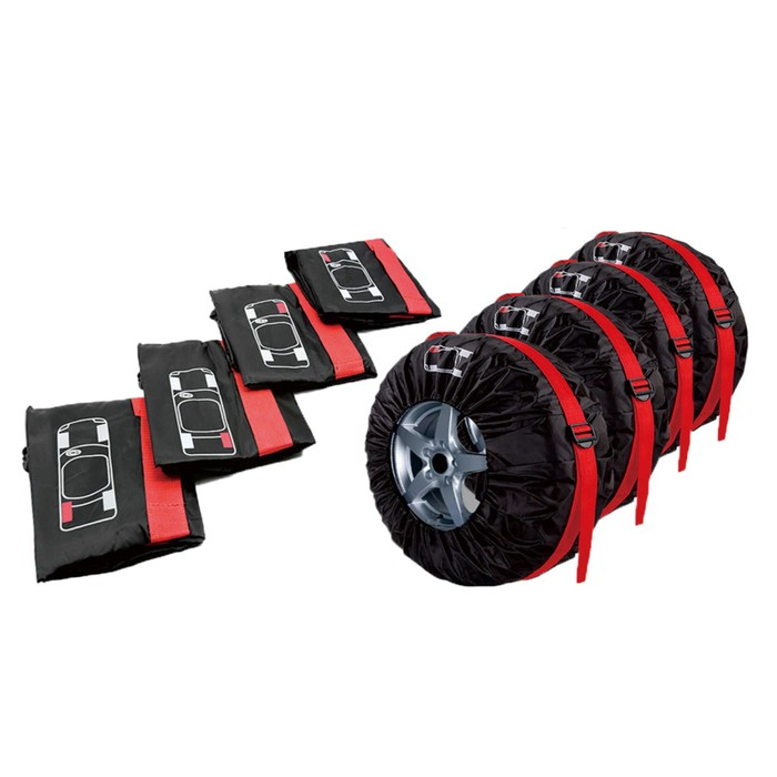 Набор чехлов на автомобильные колеса предназначен для хранения и транспортировки автомобильных колёс. Они предохраняют от пыли и царапин салон автомобиля или багажник. Чехол для шин регулируется с помощью застежки, легко и быстро надевается, снимается и легко складывается.