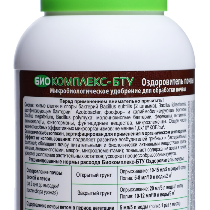 Главным преимуществом ""Биокомплекса-БТУ"" является его универсальность. Препарат можно использовать для оздоровления почвы на любых типах почв и для выращивания различных культур. Благодаря использованию данного препарата, урожайность растений увеличивается на 20-30%, а также сокращается время их роста и развития.