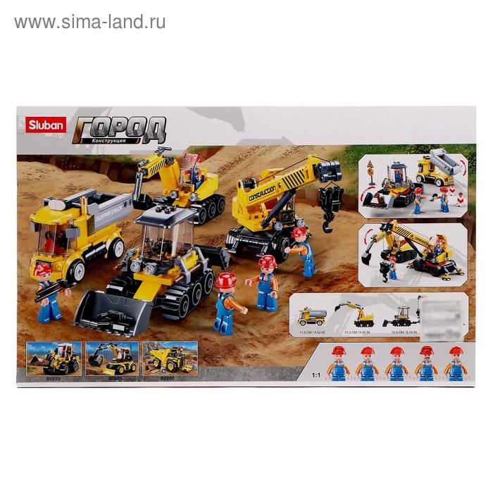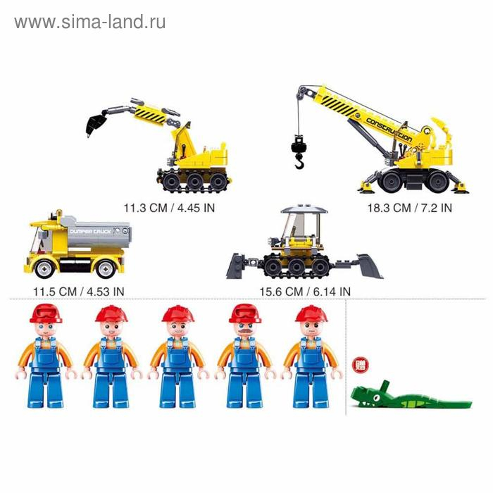 - Из конструктора ребёнок сможет собрать 4 машинки спецтехники, 6 фигурок и дорожные знаки.
