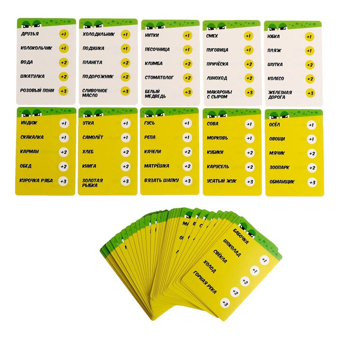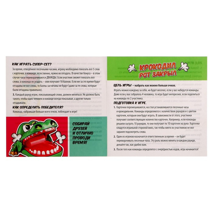 Нажимайте на один из зубов крокодила, чтобы проверить свою удачу. Если нажимаете на «неправильный» зуб — пасть закрывается и вы переходите в следующую игру «Супер-сет». За ограниченное количество времени вы рассказываете участникам 5 слов с карточки. Есть возможность получить сразу 10 баллов. Но если игроки не угадали слова, то все баллы сгорают.