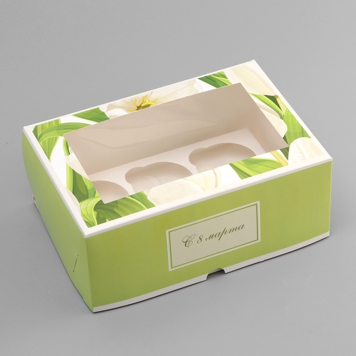 Коробка для 6 капкейков с окном , "8 марта", 25 х 17 х 10 см, кондитерская упаковка