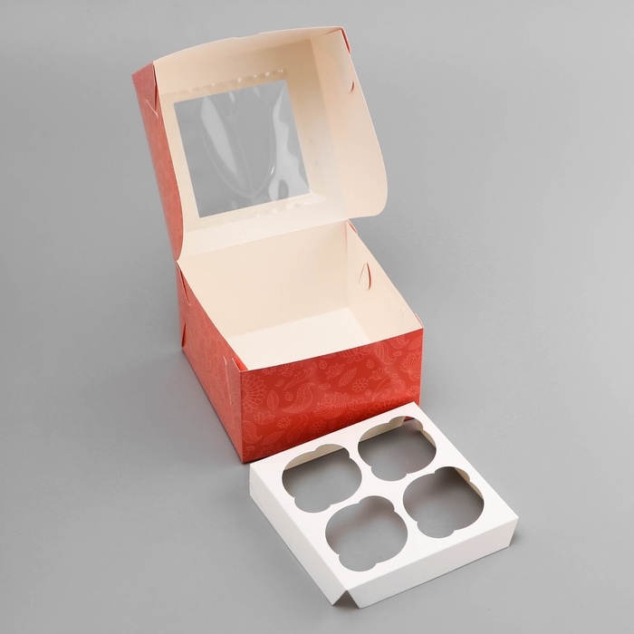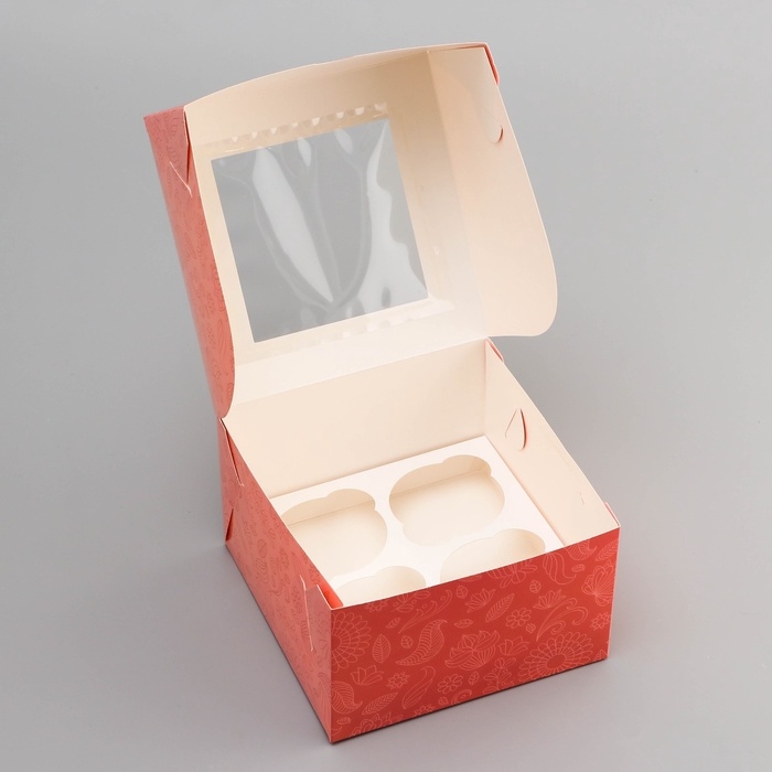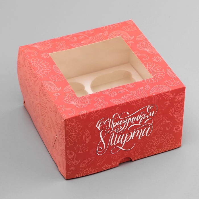 Коробка под 4 капкейка с окном , "С Праздником 8 марта", 16 х 16 х 10 см, кондитерская упаковка
