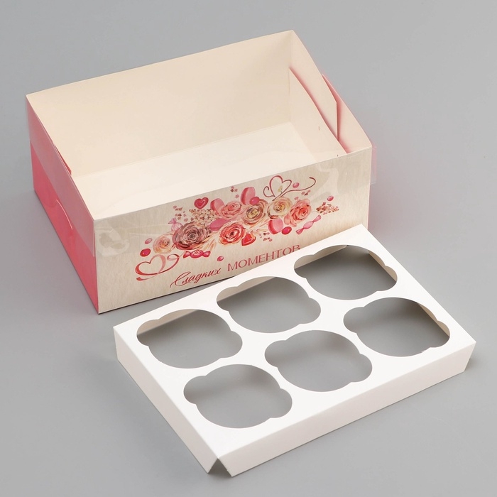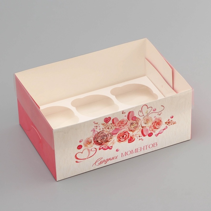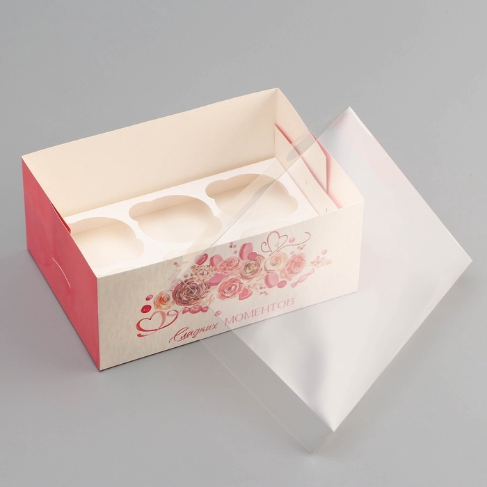Коробка для 6 капкейков с прозрачной крышкой, "Сладких моментов", 23 × 16 × 10 см, кондитерская упаковка