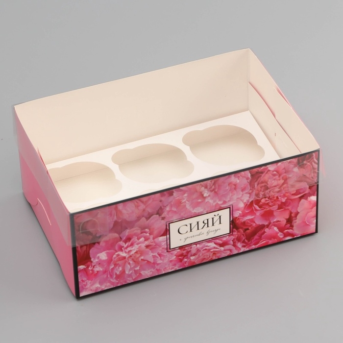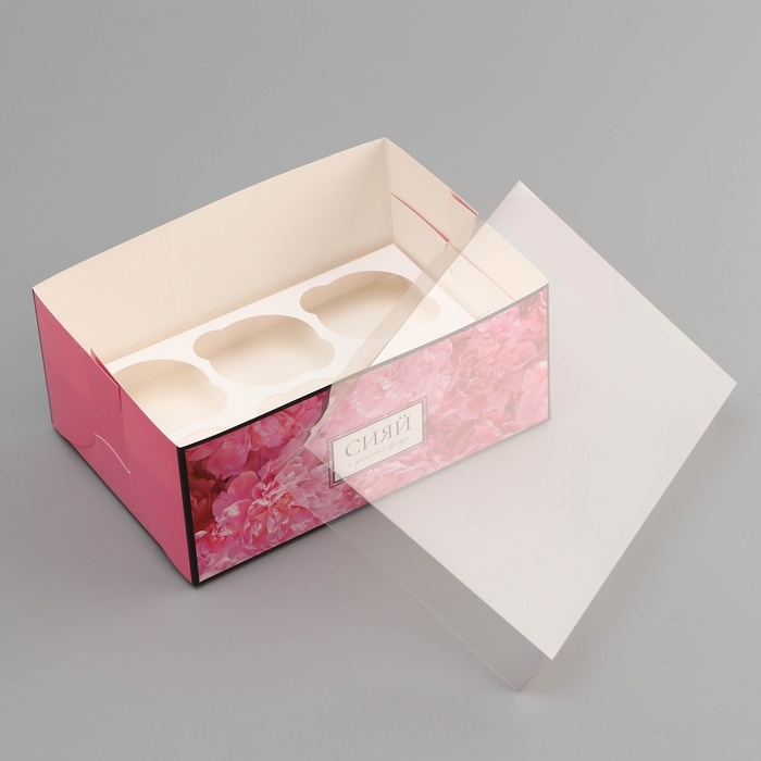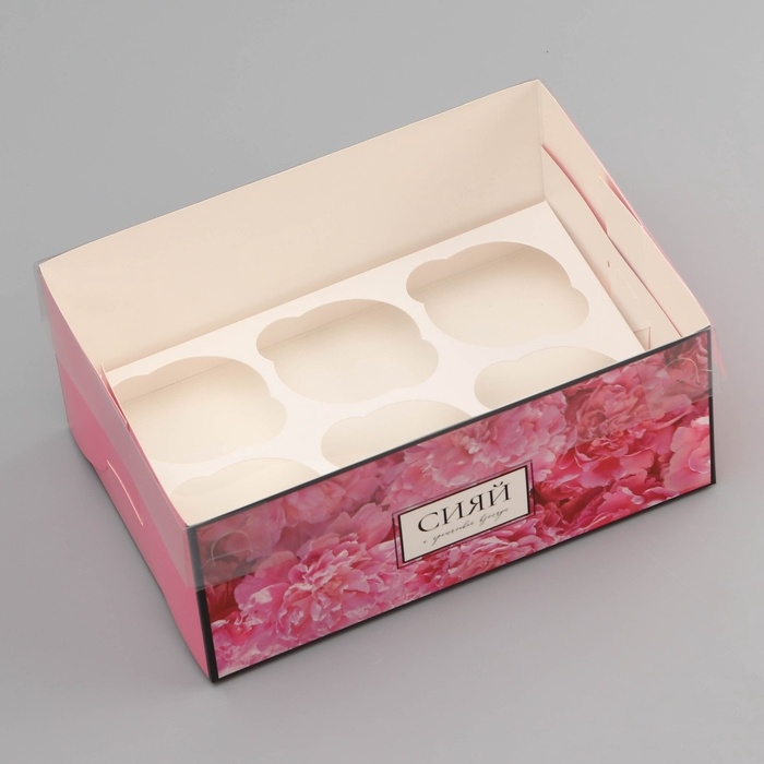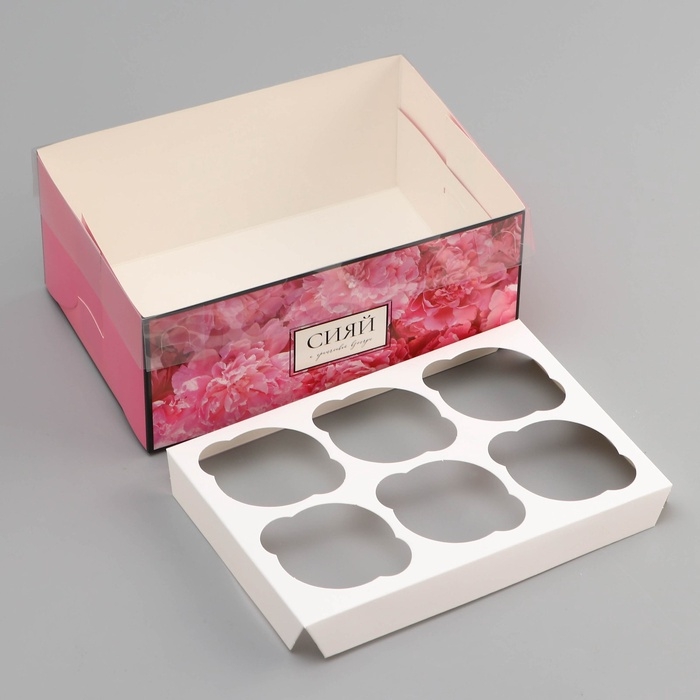 Коробка для 6 капкейков с прозрачной крышкой, "Сияй от счастья", 23 × 16 × 10 см, кондитерская упаковка