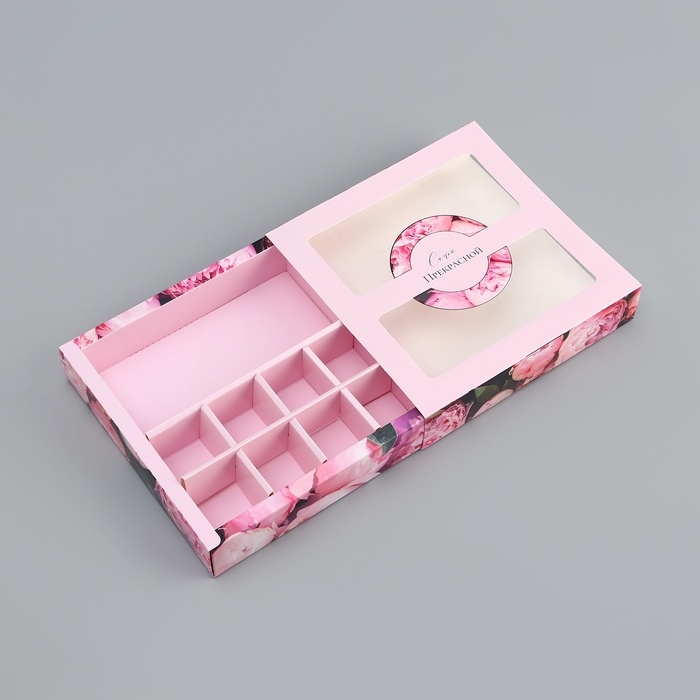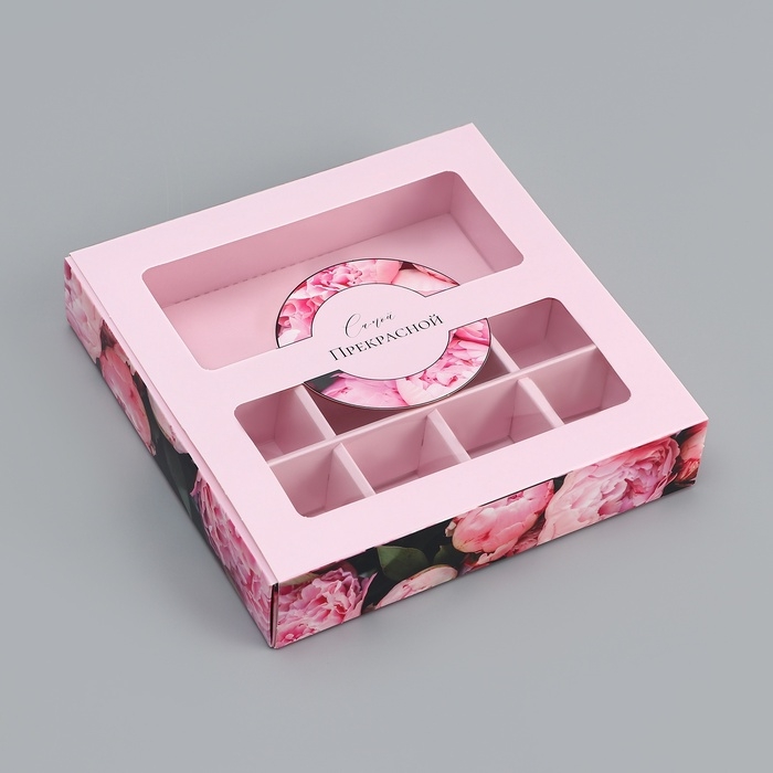 Коробка для 8 конфет + шоколад, с окном "Самой прекрасной", 17,7 х 17,8 х 3,8 см. Кондитерская упаковка