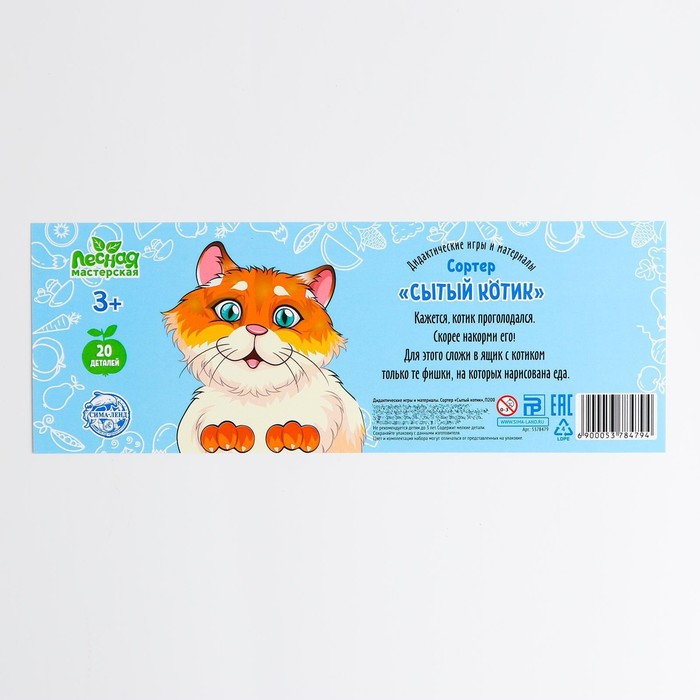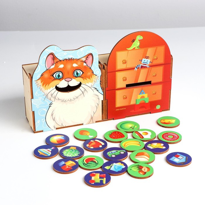 Кажется, котик проголодался. Скорее накорми его! Для этого сложи в ящик с котиком только те фишки, на которых нарисована еда.