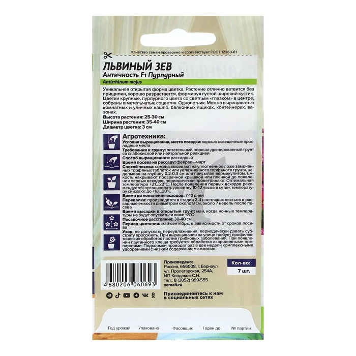 Семена цветов Львиный зев "Античность", пурпурный, ц/п, 7 шт