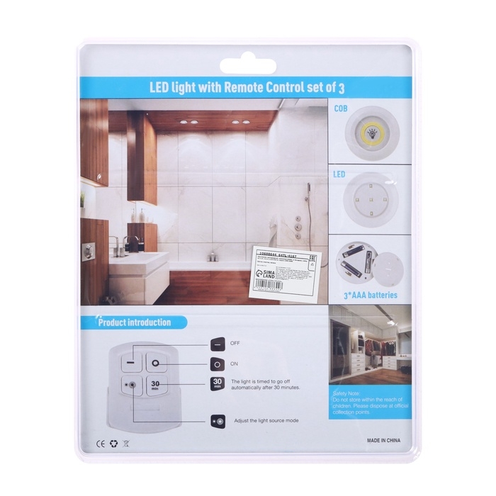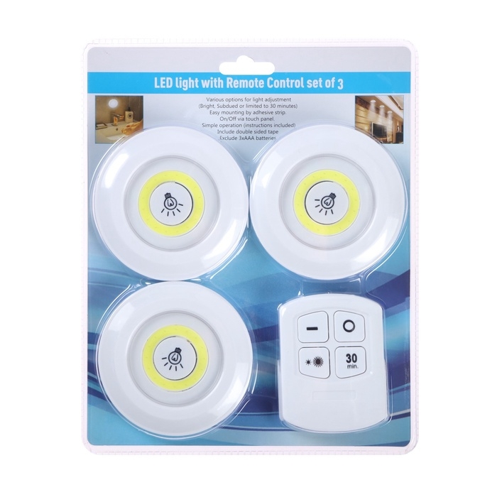 Светильник светодиодный, нажимной 6500К, от батареек, набор из 3 шт, пульт в комплекте