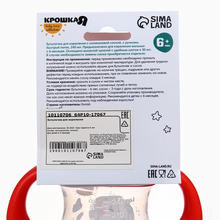 Детская бутылочка изготовлена в России из сырья отечественного производства. Все материалы сертифицированы и безопасны для здоровья новорождённых. Полипропилен и силикон не выделяют вредных веществ при стерилизации и контакте с жидкостью.