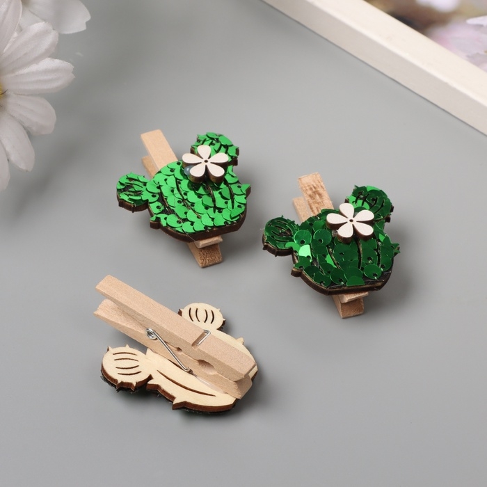 Декор для творчества дерево "Прищепка. Кактус с цветком" пайетки набор 3 шт 1,5х4х4,8 см