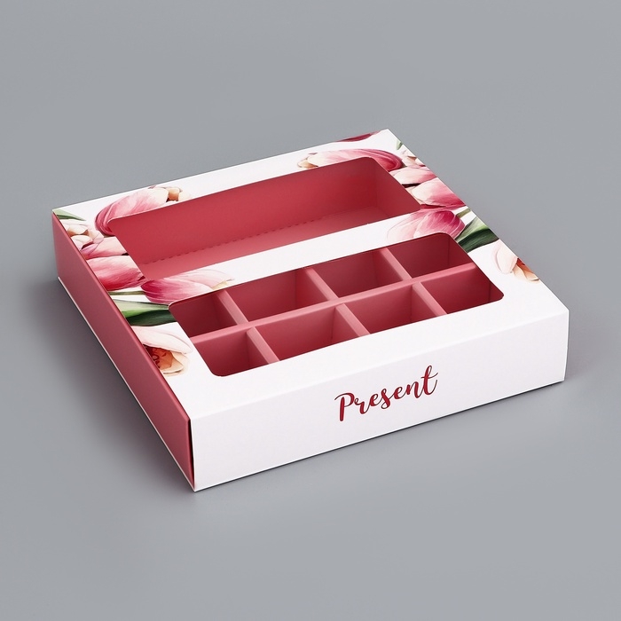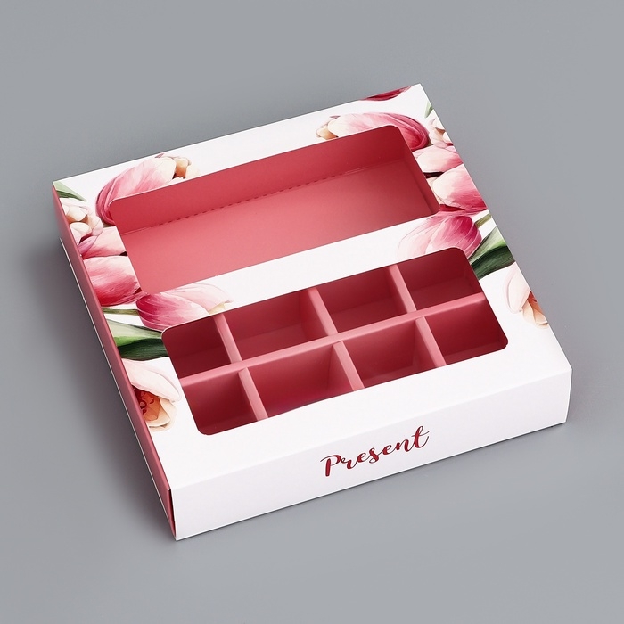 Коробка для 8 конфет + шоколад, с окном "Презент", 17,7 х 17,8 х 3,8 см. Кондитерская упаковка