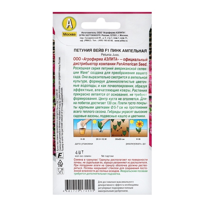 Семена цветов Петуния "Вейв" F1 пинк ампельная, ц/п, 4 шт