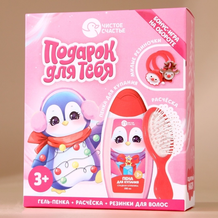 Подарочный набор детский ЧИСТОЕ СЧАСТЬЕ «Пингвинёнок»: пена для купания 250 мл, расчёска и резинки для волос, Новый Год