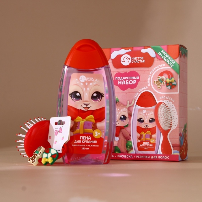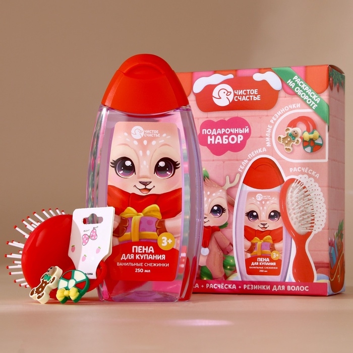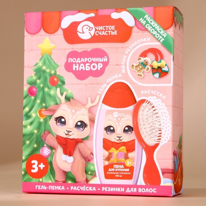 Подарочный набор детский ЧИСТОЕ СЧАСТЬЕ «Оленёнок»: пена для купания 250 мл, расчёска и резинки для волос, Новый Год