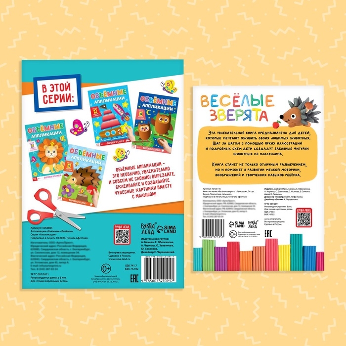 Творческий набор «Аппликации и фигурки» — это увлекательное решение для детей от 3 лет, которое поможет развить творческие способности, мелкую моторику и фантазию. В комплект входят две книги с пошаговыми инструкциями, цветная бумага, ножницы и пластилин — всё, что нужно для создания объёмных аппликаций и фигурок.
