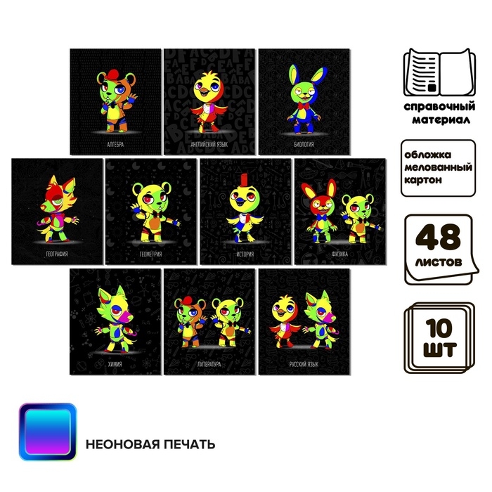 Компл предм тетр 48л 10 предм Неоновые звери Calligrata TOP, справ мат,мел карт,НЕОН,офсет