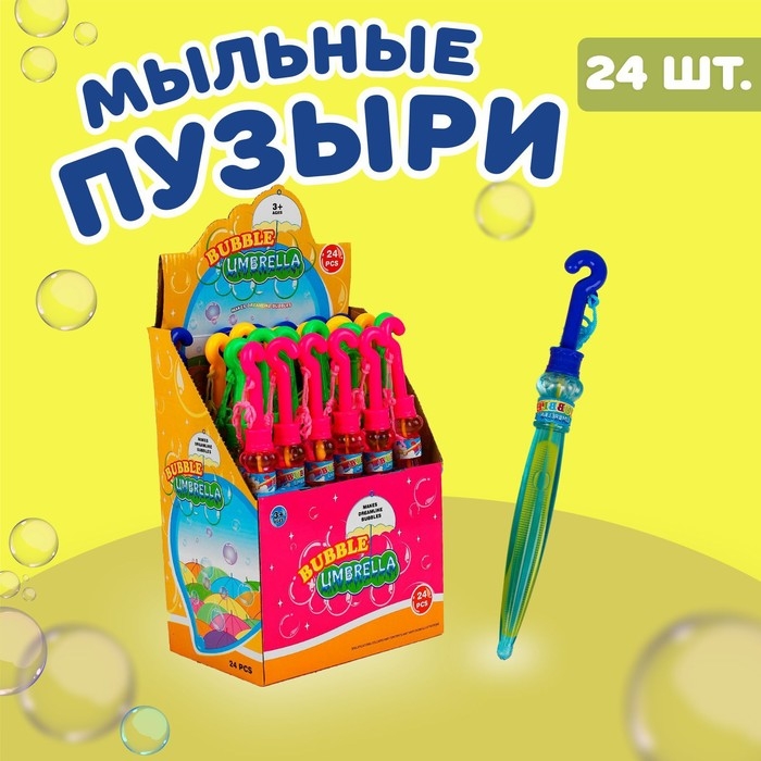 Флакон мыльных пузырей выполнен в виде яркого зонтика с ручкой. Для удобства ребенок может зафиксировать его на себе с помощью верёвочки.