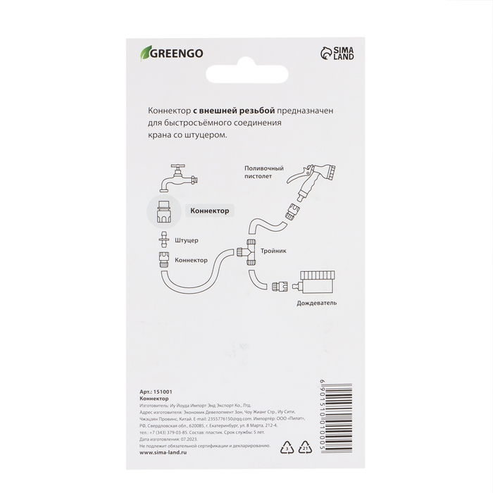 Коннектор предназначен для соединения шланга с пистолетами-разбрызгивателями, кранами, для соединения труб и шлангов между собой. Также может служить в качестве переходника с одного диаметра изделия на другой.