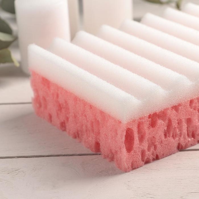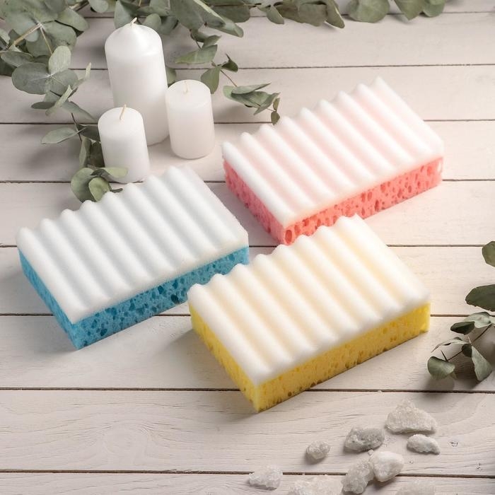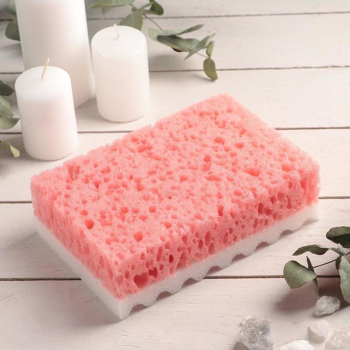 Губки состоят из двух слоёв — мягкого деликатного и грубого пористого. Изделия хорошо применять для массажа тела. Шероховатая сторона губки эффективно стимулирует кровообращение, отшелушивает и удаляет мёртвую кожу. Благодаря пористой структуре губки моющие средства обильно пенятся даже в небольшом количестве.