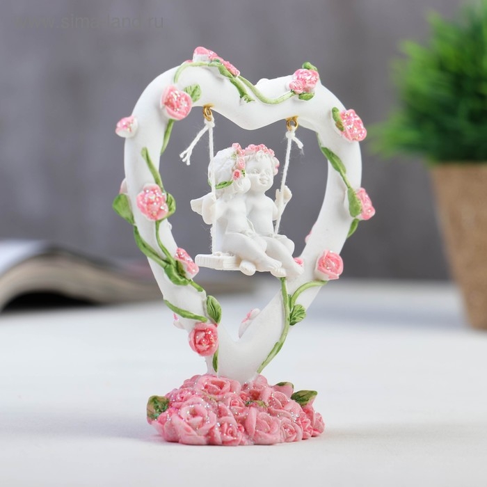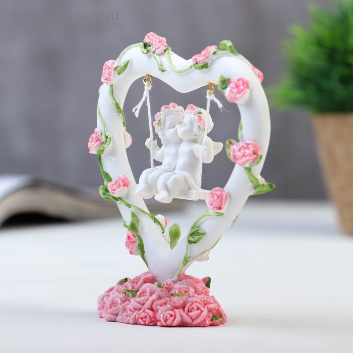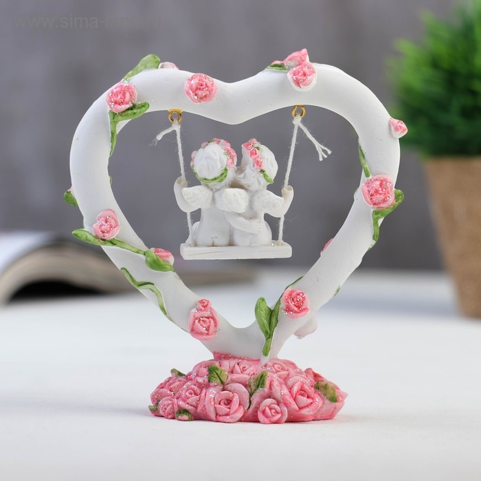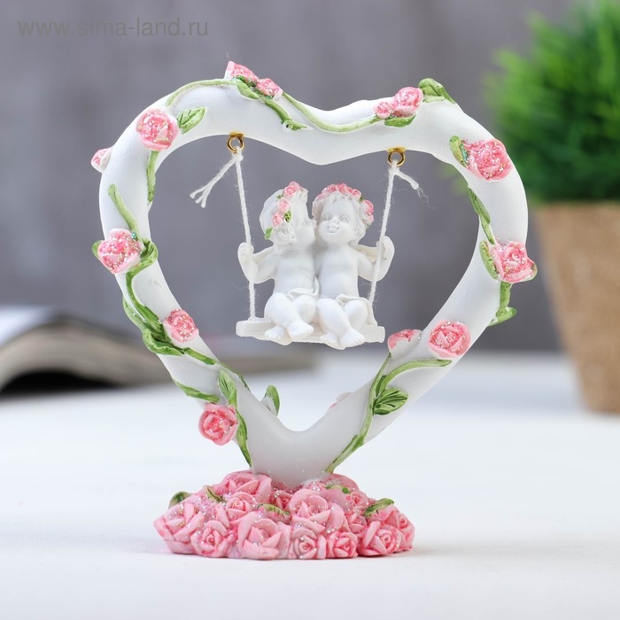Сувенир "2 ангелочка на качелях в сердце" в венке из роз 11х10х4 см