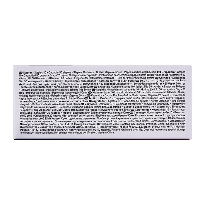 Степлер со встроенным антистеплером изготовлен из ударопрочного пластика с высококачественным стальным механизмом. Вмещает до 50 скоб №10. Пробивает до 20 листов. Глубина закладки бумаги до 50 мм. Гарантия на механизм 2 года при условии использования скоб ErichKrause.