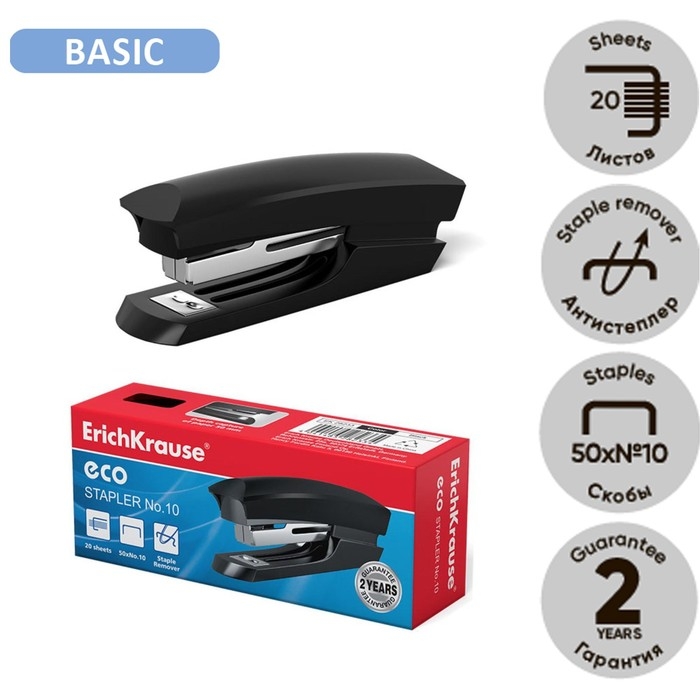 Степлер ErichKrause ECO № 10, до 20 листов, компактный, встроенный антистеплер, чёрный