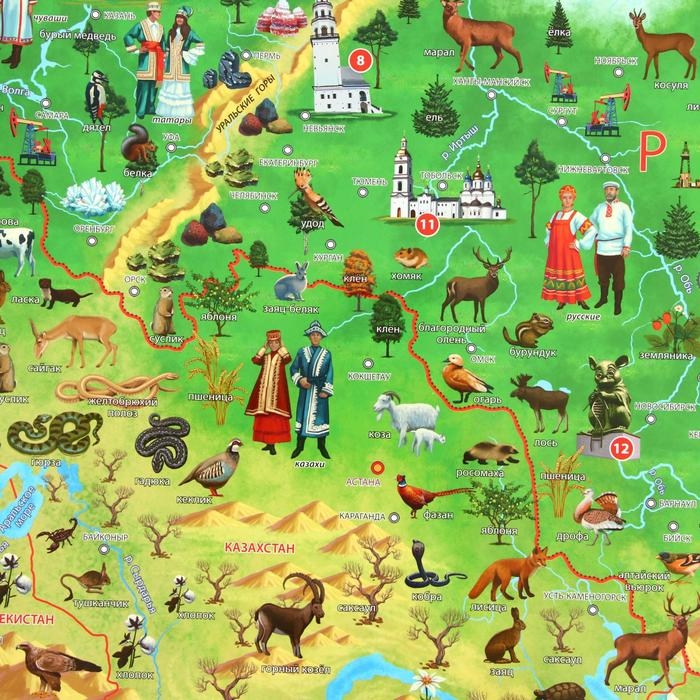 Как рассказать ребенку о нашей необъятной стране? Лучше всего наглядно. На карте можно увидеть представителей народов России и соседних стран, животные и растения, которые можно повстречать на просторах нашей Родины, месторождения полезных ископаемых, национальные достопримечательности и многое другое.