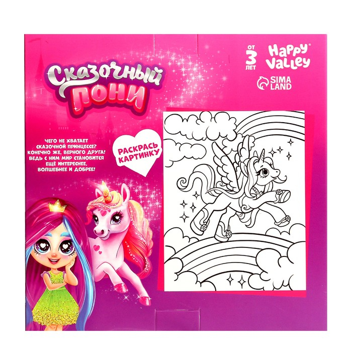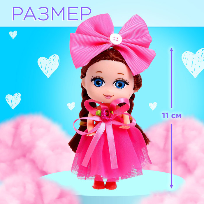 Кукле-малышке с длинными волосами ребёнок сделает причёску. В набор входит весёлый поняшка размером 6 × 3 × 10 см. Высота куколки — 11 см.