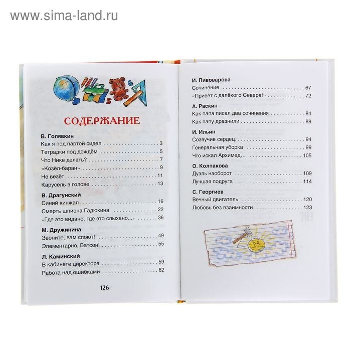 В книгу вошли следующие произведения: В. Голявкин «Как я под партой сидел», «Тетрадки под дождем», «Что Нике делать?», «Козел-баран», «Не везет», «Карусель в голов», В. Драгунский «Синий кинжал», «Смерть шпиона Гадюкина», «Где это видано, где это слыхано…», М. Дружинина «Звоните, вам споют!», Л. Каминский «В кабинете директора», «Работа над ошибкам», И. Пивоварова «Сочинение», «Привет с далекого Севера!, А. Раскин «Как папа писал два сочинения», «Как папу дразнили», М. Москвина «Пирамид», И. Ильин «Генеральная уборка», «Что искал Архимед», О. Колпакова «Дуэль наоборот», «Лучшая подруга», С. Георгиев «Любовь без взаимности», «Вечный двигатель».Художники: Е. Кузнецова, А. Халилова, В. Долгов.