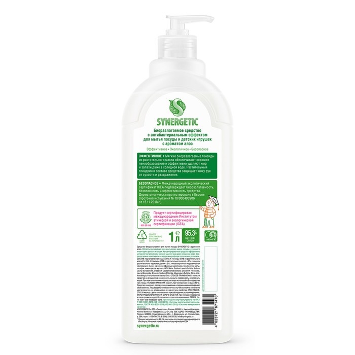 Средство для мытья посуды Synergetic "Алоэ вера", с антибактериальным эффектом, 1 л