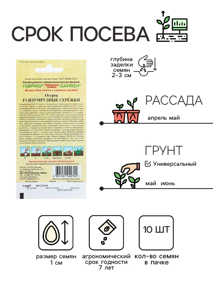Семена Огурец "Изумрудные сережки" F1, корнишон, раннеспелый, партенокарпический, 10 шт