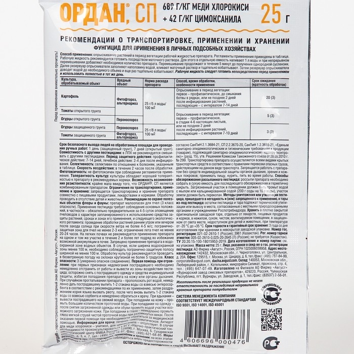 Средство от болезней на картофеле и овощных культурах "Август", "Ордан", 25 г
