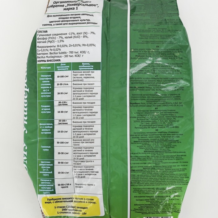 «Универсал» — это комплексное гранулированное удобрение на основе низинного торфа, в состав которого входят гуминовые соединения, макро- и микроэлементы. Оно предназначено для основного внесения в почву. Средство представляет собой тёмно-серые гранулы диаметром 1–6 мм.