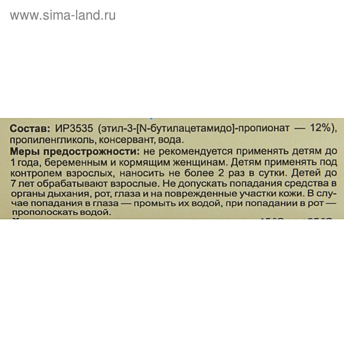 Содержит: ИР3535 (этил-3-[N-бутилацетамидо]-пропионат — 12%), пропиленгликоль, консервант, вода.