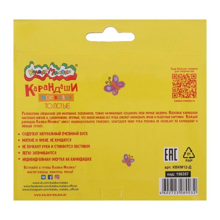 Мелки восковые 12 цветов, "Каляка-Маляка", толстые круглые