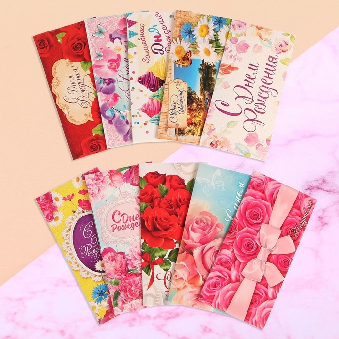 Набор конвертов для денег «С Днём рождения» для прекрасных дам, 10 шт. — отличный вариант для тех, кто не любит тратить время, бегая по магазинам в поисках конвертов.