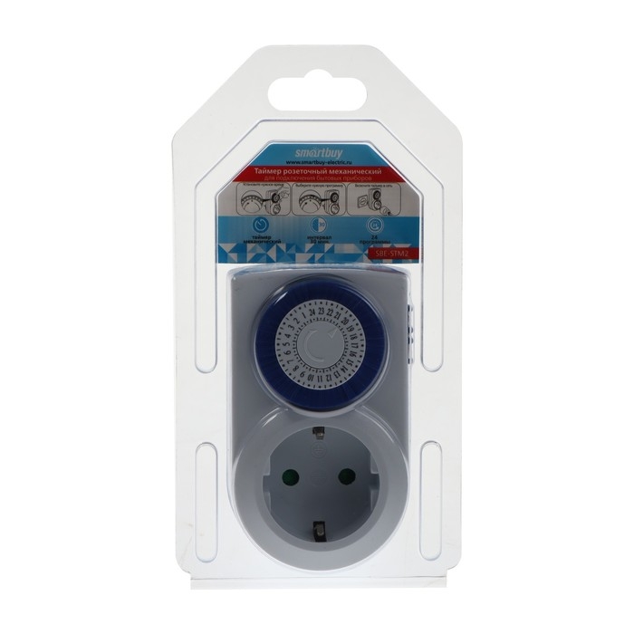 Розетка с таймером выполнена из прочного пластика, не подверженного внешним воздействиям. Тип таймера – механический. Розетка имеет 48 интервалов включений/отключений с периодичностью 30 минут.