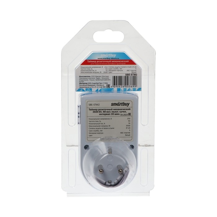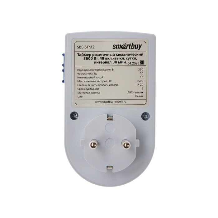 Таймер розеточный Smartbuy, механический, 3600 Вт, 48 вкл./выкл. сутки, интервал 30 мин