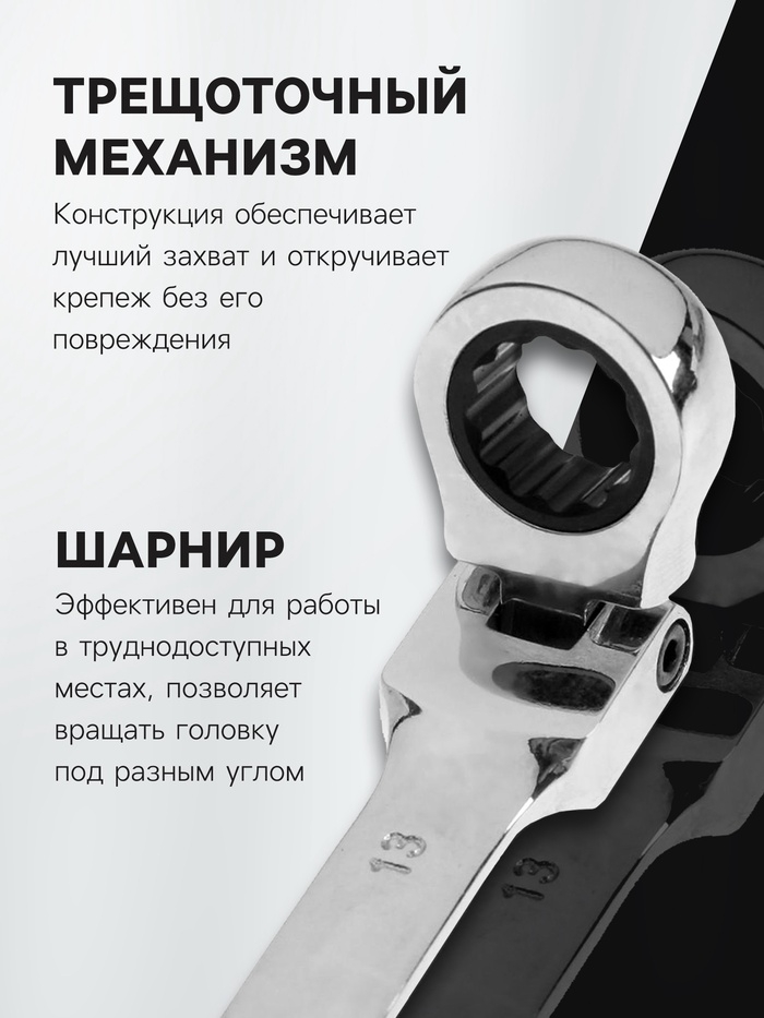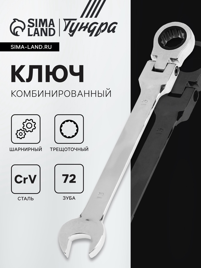 Ключ комбинированный трещоточный шарнирный ТУНДРА, CrV, полированный, 72 зуба, 13 мм