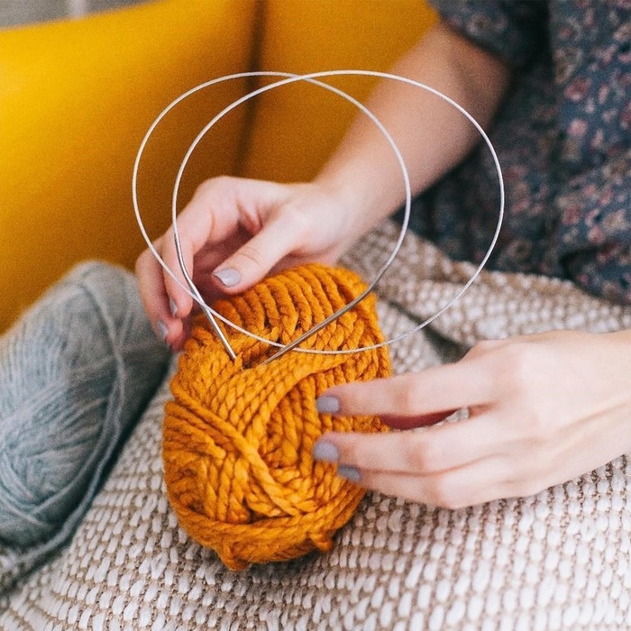 Круговые спицы представляют собой две металлические части, соединённые друг с другом тросиком. Инструмент незаменим при вязании полотна по кругу. С его помощью получаются изделия без дополнительных швов: шапки, рукава и горловины.