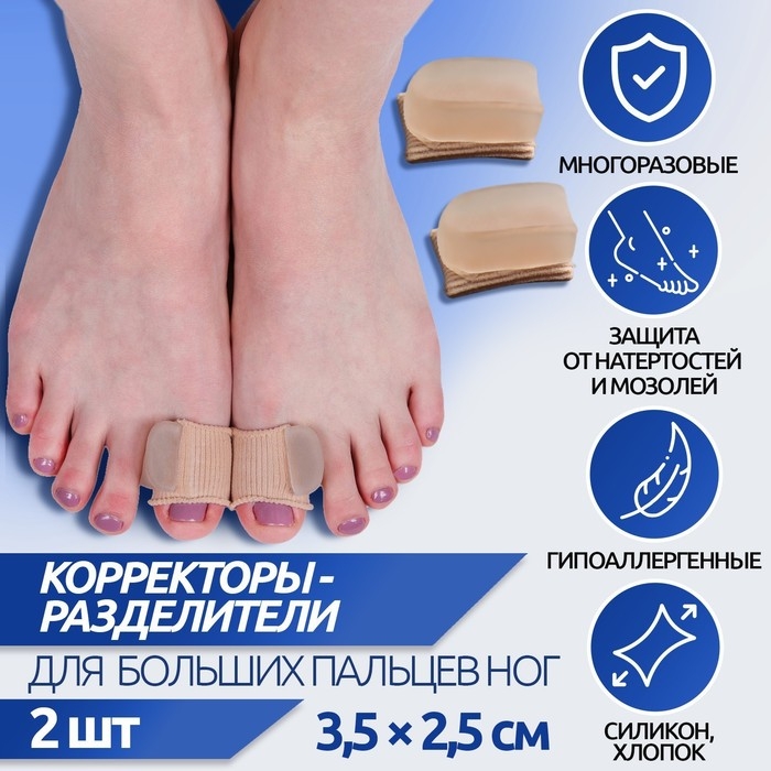 Корректоры - разделители для пальцев ног, с накладкой на косточку большого пальца, 1 разделитель, силиконовые, 7,5 × 6 см, пара, цвет белый