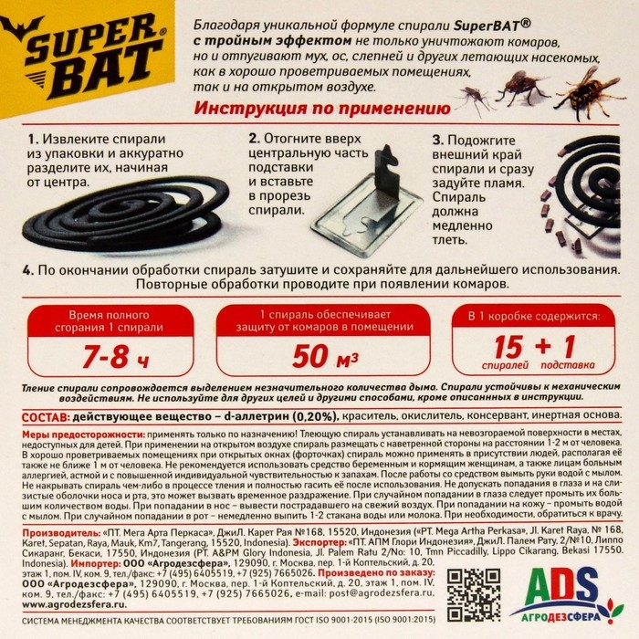 ОписаниеС наступлением летнего сезона обеспечьте себе защиту от насекомых. К эффективной и надежной относятся бездымные спирали от комаров SuperBAT. Существует много репеллентов пластины, ловушки, таблетки, браслет, жидкость, но бездымная спираль от комаров идеальное решение для использования на как на открытом воздухе для дачи и сада, пикника и отдыха на природе, так и в помещении. Действие ловушки начинается сразу после поджигания спирали через несколько минут, отгоняет и убивает кровопийц. Конец спирали поджигается, а пламя задувается. Спираль не гаснет под действием легкого ветра, без проблем может использоваться на открытом воздухе на протяжении 7-8 часов, а также в комнате вместо фумигатора и аэрозоля. Медленное тление обеспечит надежную защиту от укусов летающих насекомых. Удобный размер упаковки легко брать с собой на прогулки. Действующее вещество аллетрин. В индивидуальной упаковке 15 спиралей.Составдействующее вещество - d-аллетрин (0,20%), краситель, окислитель, консервант, инертная основа.Инструкция Извлеките спирали из упаковки и аккуратно разделите их, начиная от центра. Отогните вверх центральную часть подставки и вставьте в прорезь спирали. Подожгите внешний край спирали и сразу задуйте пламя. Спираль должна медленно тлеть.По окончании обработки спираль затушите и сохраняйте для дальнейшего использования. Повторные обработки проводите при проявлении комаров.