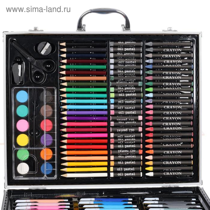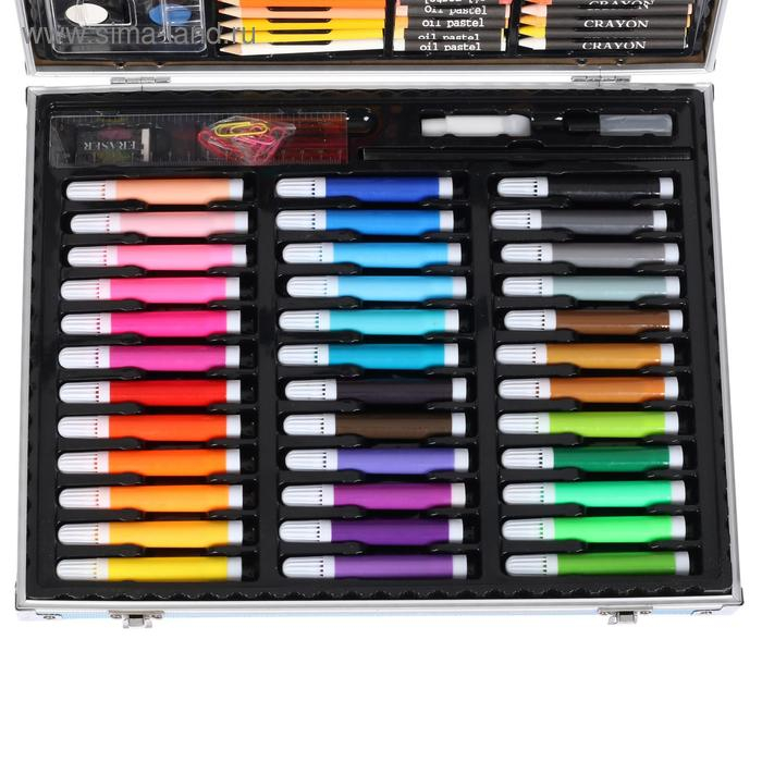 Набор состоит из: Набора цветных карандашей, акварельных красок с кистью, набора цветной пастели, восковых мелков, а так же широкий выбор цветных фломастеров. Для более удобной и продуктивной работы, в комплекте так же есть линейка, ножницы, ластик, степлер, точилка, корректор, кисть с полостью для воды, и простой карандаш. Широкий выбор канцтоваров для творчества и работы, стильный и удобный металлический портфель, отличный набор для опытного и начинающего художника